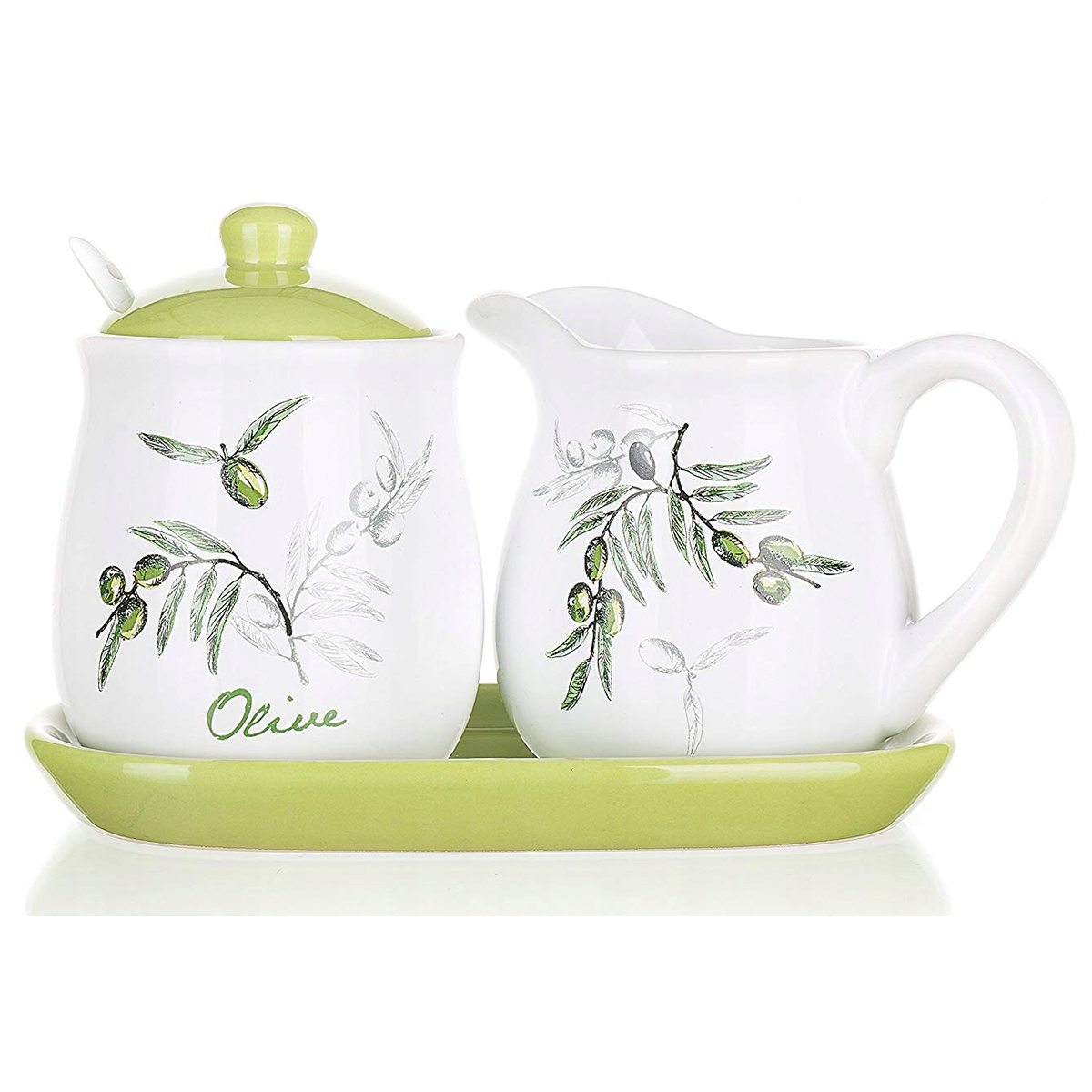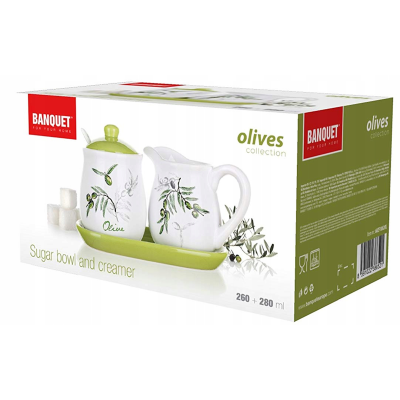 Cukiernica + mlecznik wraz z łyżeczką i podstawką w motywach OLIWKI. To doskonały, elegancki i nowoczesny design Zestaw wykonany z ceramiki zdobionej. Elegancka ozdoba i smak przy Państwa kameralnych spotkaniach. Można myć w zmywarkach. Komplet zapakowany w ładny kolorowy kartonik producenta.