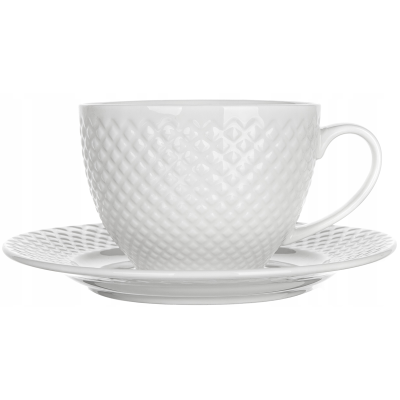 Porcelanowa filiżanka ze spodkiem z kolekcji LENA idealnie sprawdzi się w jasnych kuchniach w stylu skandynawskim lub country. Filiżanka ma szary design z białymi wzorami imitującymi haft. Wykonana jest z wysokiej jakości porcelany kostnej i można ją myć w zmywarce.