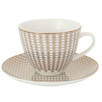 Zestaw składa się z dwóch filiżanek ze spodkami i ozdobnego opakowania