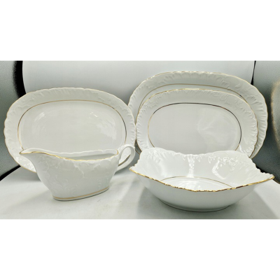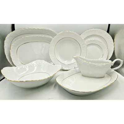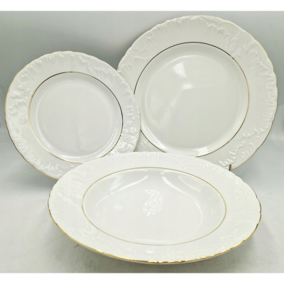 Serwis obiadowy Rococo prezentuje się doskonale w stylowych wnętrzach. Szczególnie, jeśli nawiązują one do sztuki barokowej i rokokowej. Ich wyznacznikiem w tym przypadku jest finezyjna tłoczona, bogata ornamentyka roślinna. Jej biel idealnie komponuje się z liniami ręcznie malowanymi złotem. Formy naczyń są efektem odnalezienia równowagi między smukłymi a krągłymi kształtami.