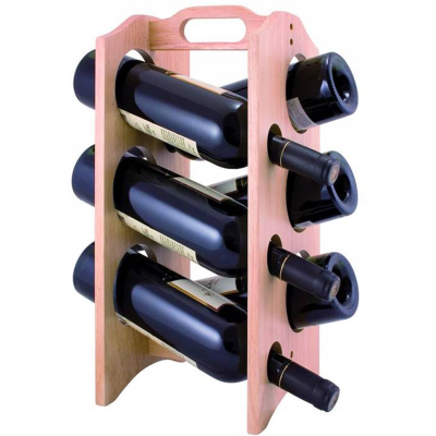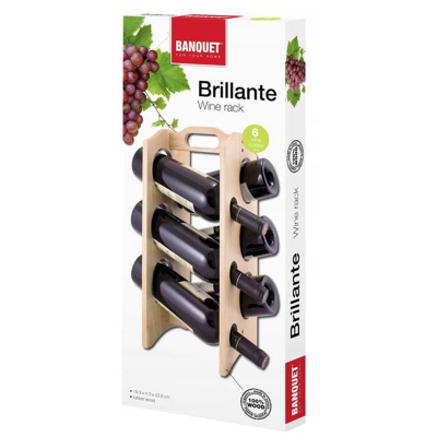 Stojak jest przeznaczony do 6 butelek wina, można go przenosić, wysokość 44 cm, szerokość bocznej ściany z otworami na butelki 18 cm, otwory o średnicy 4 i 8,5 cm.