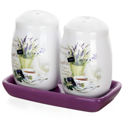 Lawendowy zestaw ceramiczny LAVENDER marki Banquet to elegancki komplet do serwowania – idealny na prezent i do codziennego użytku. Zestaw zawiera mlecznik, cukierniczkę, solniczkę, pieprzniczkę oraz serwetnik z lawendową dekoracją, zapakowany w ozdobne pudełko.