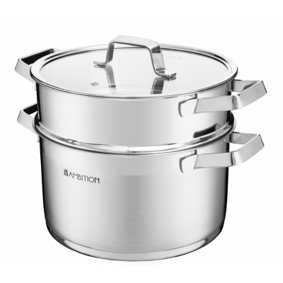 Garnek do gotowania na parze Ambition Kitchen Pro 94516 o średnicy 20 cm i pojemności 2,9 l wykonany jest ze stali nierdzewnej 18/10, z trójwarstwowym dnem przystosowanym do wszystkich typów kuchenek, w tym indukcji. Pokrywka ze szkła hartowanego umożliwia użycie garnka w piekarniku do 180 °C, a wewnętrzna skala ułatwia precyzyjne odmierzanie płynów.