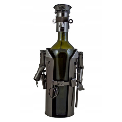 Metalowy stojak na wino „Policjant” to ręcznie wykonana dekoracja ze stali, idealna na prezent dla funkcjonariuszy i miłośników służb mundurowych. Pasuje do butelek o średnicy do 7,7 cm i wyróżnia się trwałością oraz oryginalnym designem z czapką, pałką i kajdankami.