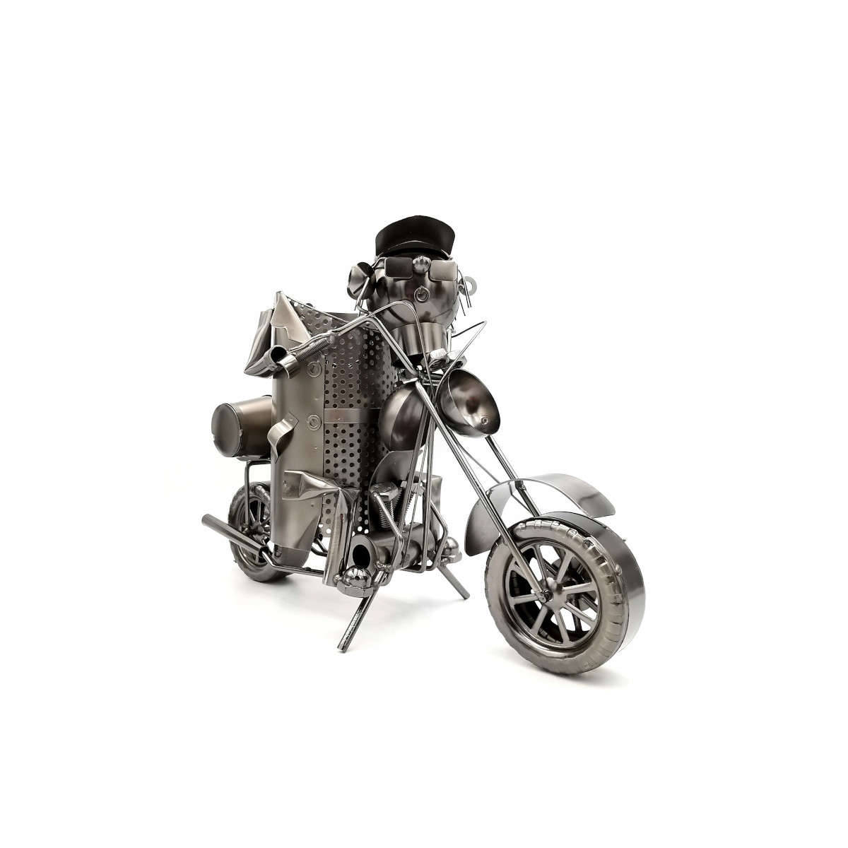 Ręcznie wykonany stojak na wino „Motocyklista” z trwałej stali to idealny prezent dla fanów motoryzacji i stylowych dodatków do wnętrz. Pasuje do butelek o pojemności 0,75 L, a jego unikalny design i eleganckie opakowanie sprawiają, że wyróżnia się jako funkcjonalna i dekoracyjna ozdoba.