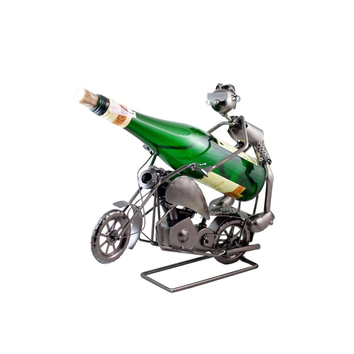 Stylowy stojak na butelkę 0,75L w kształcie motocyklisty – trwała konstrukcja ze stali, idealna na oryginalny upominek.