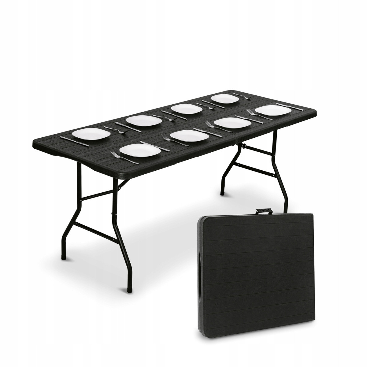 Czarny stół składany Tadar Wooden 180 x 74 x 74 cm jest duży i stabilny. Jego blat wykonano z twardego tworzywa sztucznego, co ułatwia pielęgnację. Składane pod blat nogi są stalowe i mają zabezpieczenie przed złożeniem pod ciężarem jedzenia i napojów. Gdy go nie używasz lub chcesz przewieźć, zamieni się w stół-walizkę. W tej sprytnej konstrukcji nogi modelu ukryte są wewnątrz. Uchwyt pomoże natomiast w komfortowym przenoszeniu. Mając go, zadbasz, by na bankiecie było osobne miejsce na wszystkie przekąski. Rozstawisz go też, robiąc przyjęcie z cateringiem na świeżym powietrzu. Przede wszystkim jednak zyskasz stół składany w walizkę, który łatwo przechować i przewieźć. Zabierzesz go również na kemping lub użyjesz w czasie domowych imprez (np. świąt w większym gronie). cateringiem. Nawet podczas grillowania to świetna opcja na organizację przestrzeni oraz przygotowanego jedzenia.