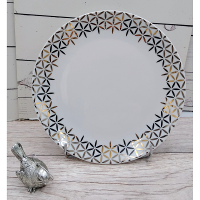 Talerz zdobiony prostym, jednolitym wzorem, który ciekawie wkomponowuje się w każde wnętrza. Dynamiki dekoracji nadaje zastosowanie dwóch kolorów: złota oraz czerni rozmieszczonej w różnych, przypadkowych miejscach. Talerz wyprodukowany został w Polsce przez Porcelanę Bogucice.
